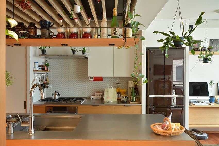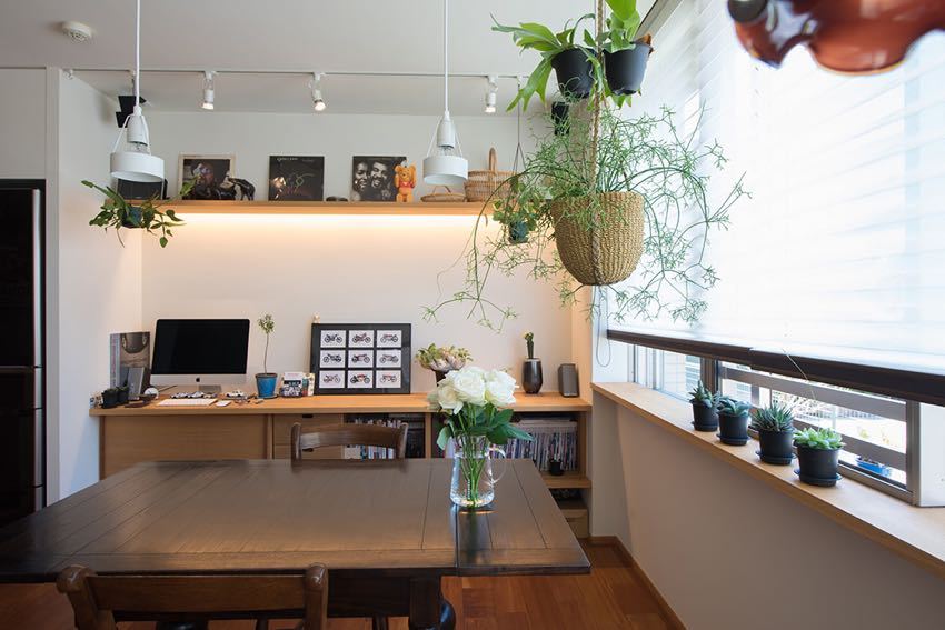 但考量工作时可能会需要参考书籍资料,摆放在餐桌上有时就显得不太方便,也可能干扰到其它人用餐,可以参考这间公寓在角落利用简单层架加上木板就能完成工作区,餐桌不够大也不用担心。