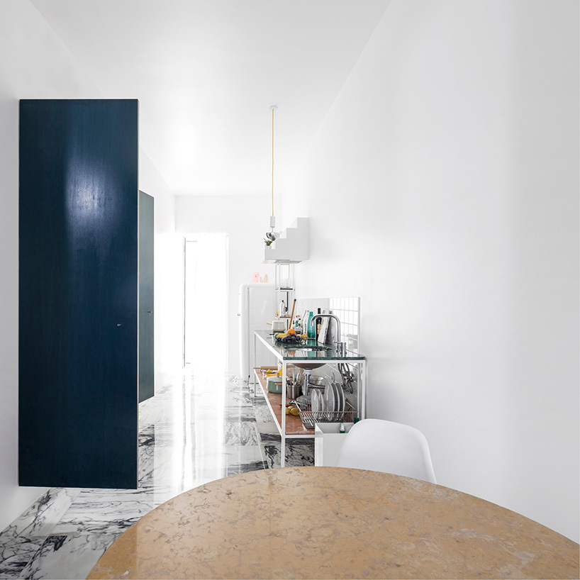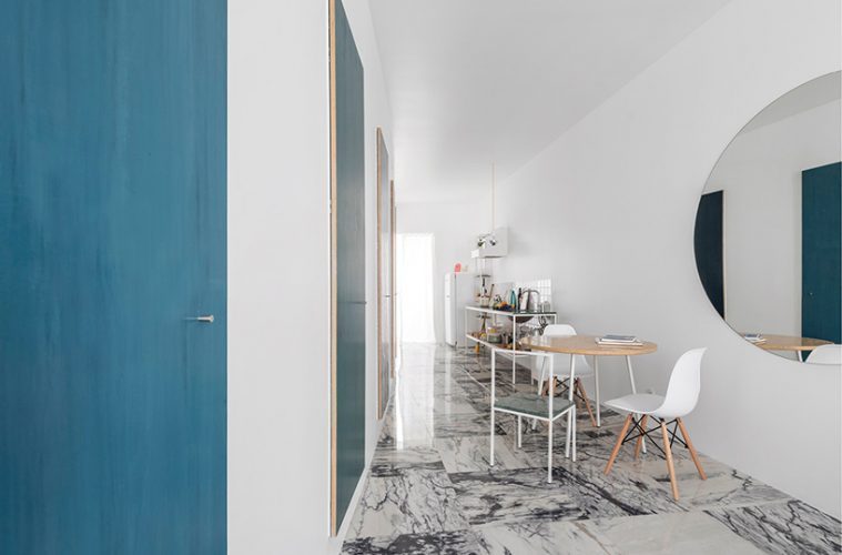 设计师目的是消除这些现有的问题,并应用可用的表面。最终,一面弯曲的墙在外墙之间延伸,定义出宽敞的公共空间和不同的私人房间。公寓的一个特色是扩展的走廊,作为餐饮和厨房中心 – 看起来更像一处画廊。它的弯曲的墙面上有用蓝色色调手绘的门,门似乎漂浮在地面上,像一套单色画。