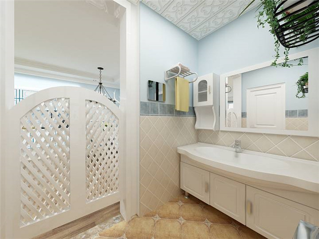 卫生间,一样用明亮的色调,把较小的空间显得大气,绿植的点缀,仿佛画中一般,美丽干净环保。