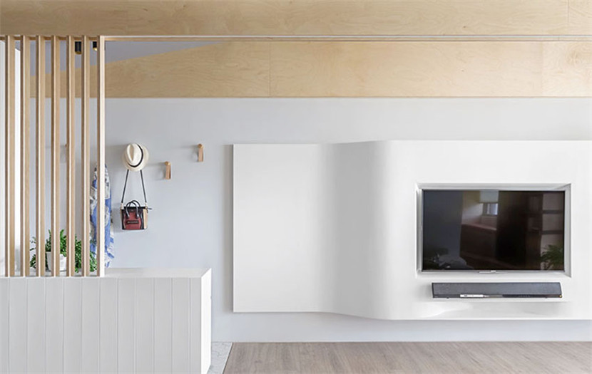 映入眼帘的是一整面弧形电视墙,材料使用木作,造型轻盈如纸。