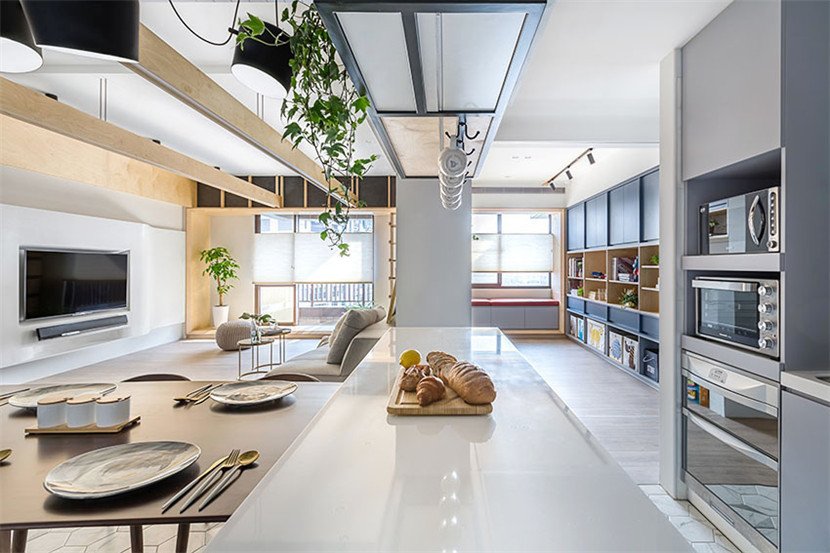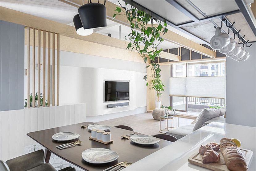 设计师在天花板下方设计了白色木梁,在视觉上可将各场域区分开来,也减少复杂的设计元素。
