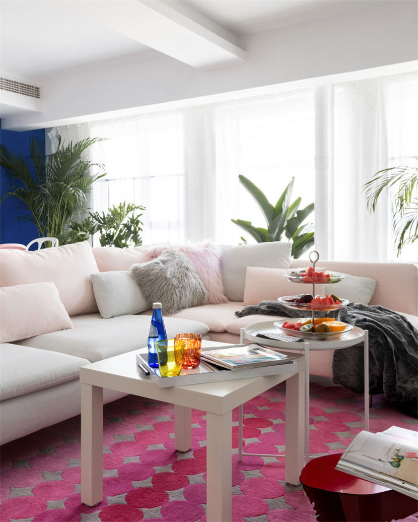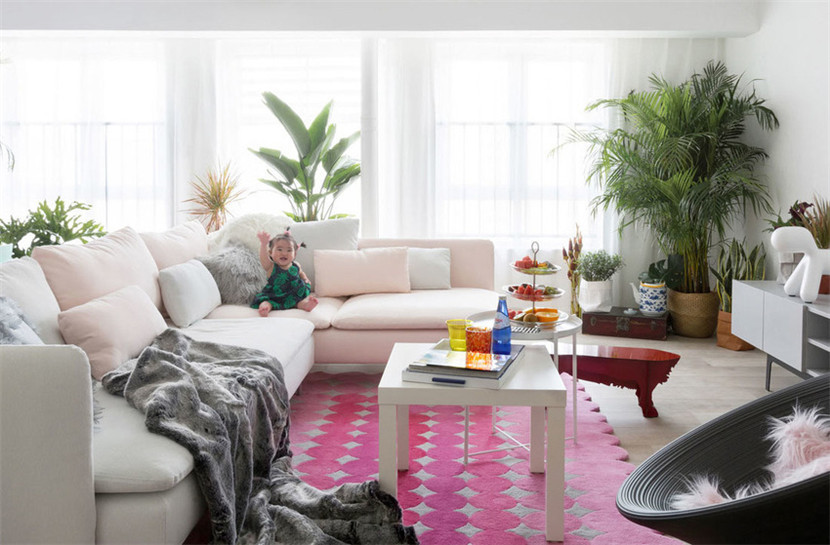 沙发选用灰色+婴儿粉,营造出甜美、柔和的氛围。