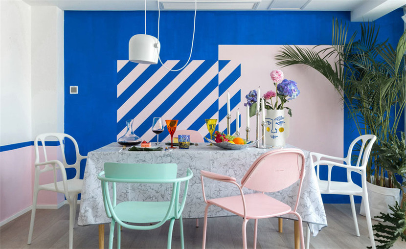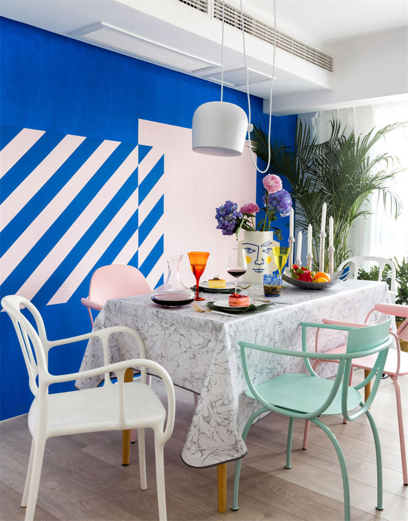 设计师在墙面上大胆的选择了撞色条纹组合,使其成为了整个空间的亮点。
