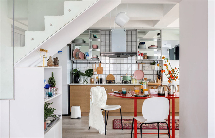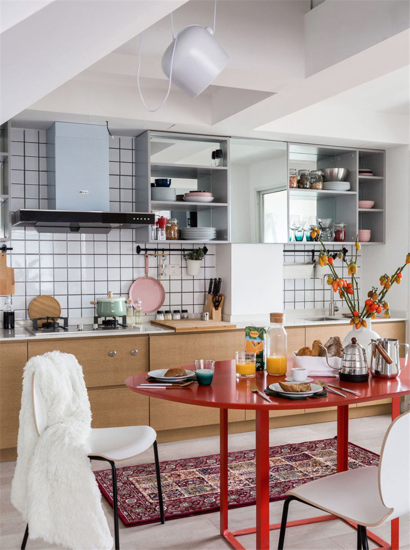 厨房区域的吊柜采用了无柜门形式:一是方便拿放东西;二是在背板镜面的映照下,整个空间显得更大。