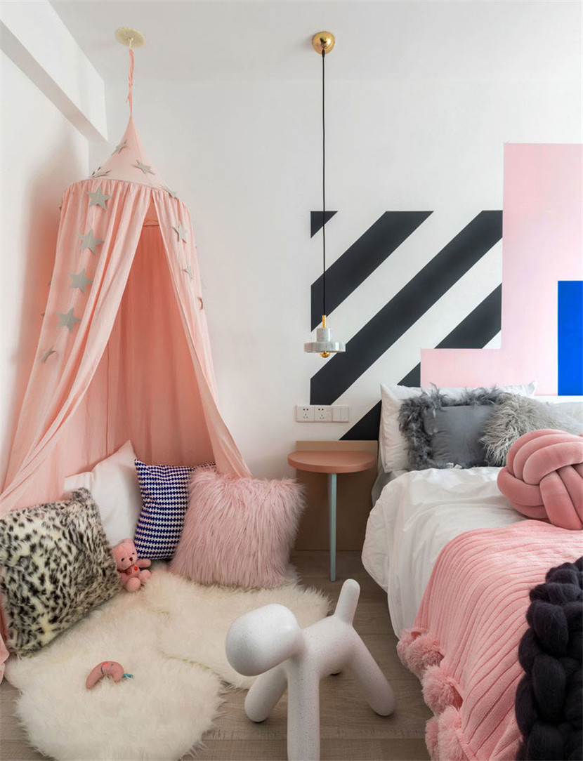 儿童房的主色调设计师选用了黑白条纹、蓝粉搭配,迎合整套房子的氛围。