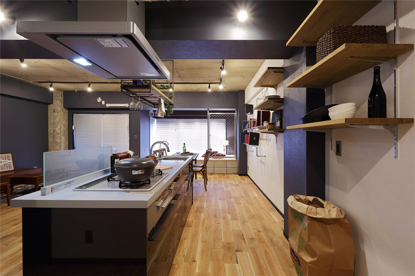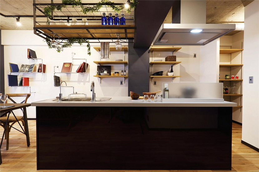 厨房区域的吊柜采用了无柜门形式:一是方便拿放东西;二是在背板镜面的映照下,整个空间显得更大。
