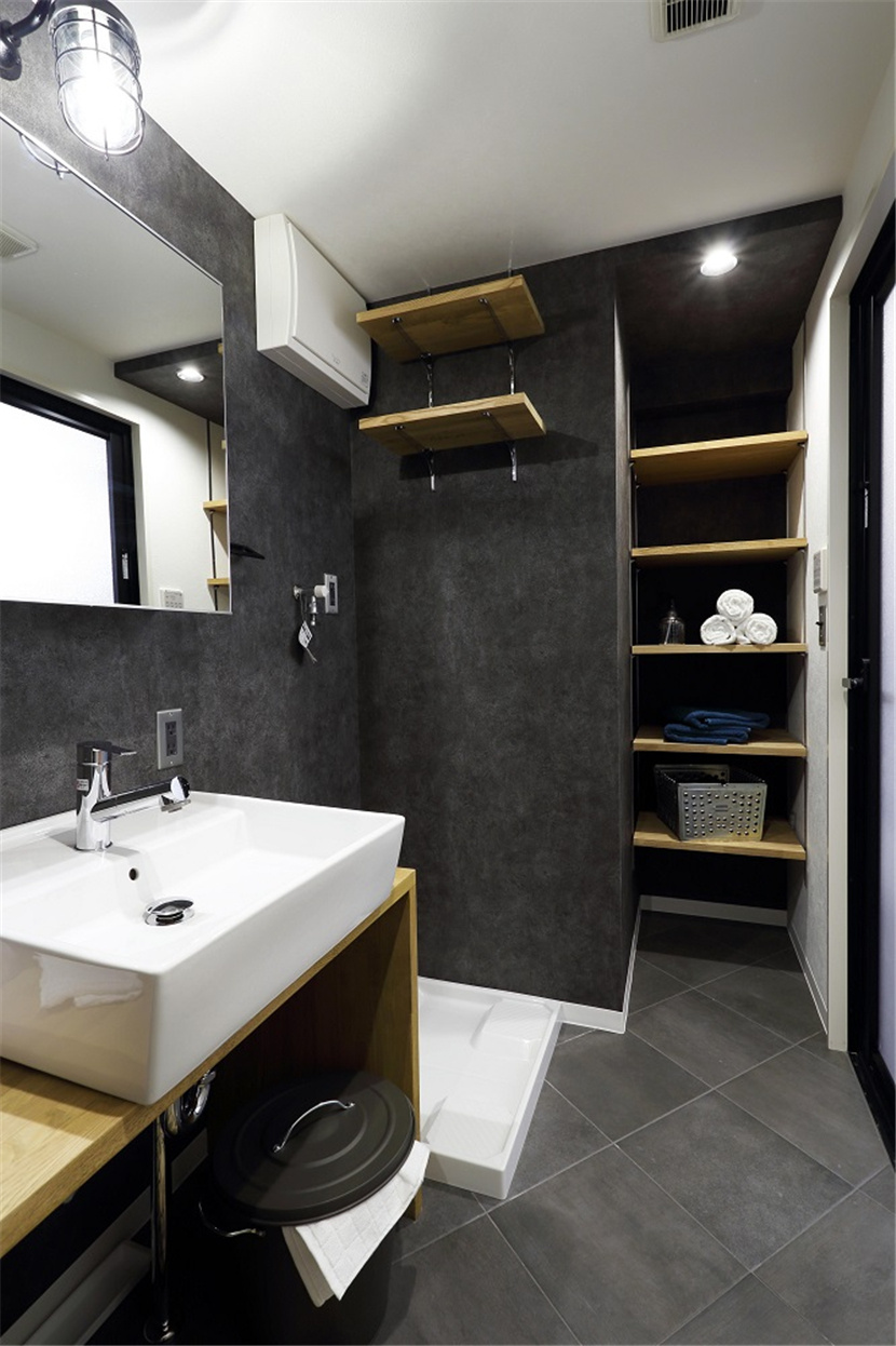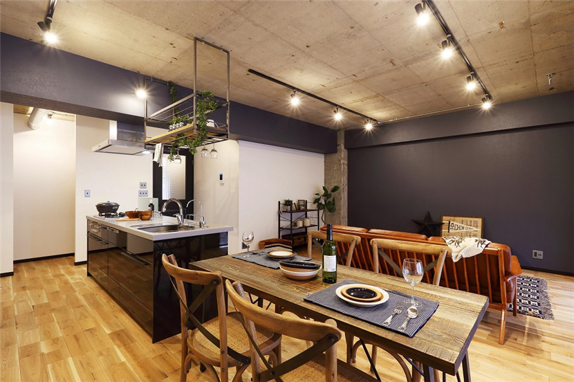 天花板的框架水泥。部分铺贴灰色壁纸,同时显露出灯线,一起营造工业气息。
