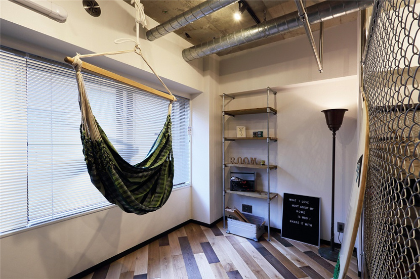 LDK区域一角是和室,红色实木板铺贴着墙壁以及天花板,通过铁丝编织的网面,分隔了两处空间,保留了原来的工业元素