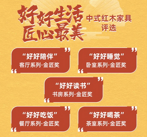 专家、媒体、大众票选精品,挖掘2020“好好生活·匠心最美”中式红木家具,包括:“好好陪伴”之客厅系列·金匠奖、“好好睡觉”之卧室系列·金匠奖、“好好读书”之书房系列·金匠奖、“好好吃饭”之餐厅系列·金匠奖、“好好喝茶”之茶室系列·金匠奖;
