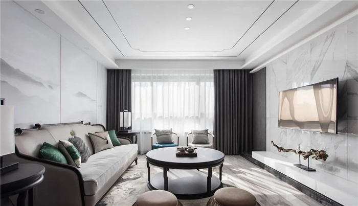 客厅以现代的装饰手法与家具结合古典中式的装饰元素,来呈现亦古亦今的空间氛围