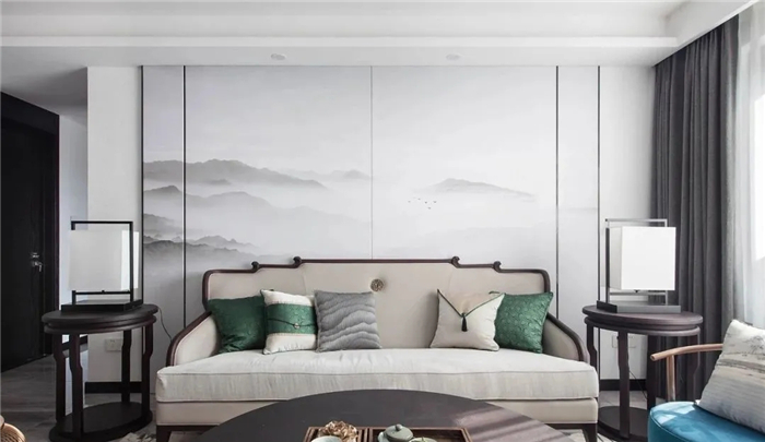 沙发背景造型简约,以中国风的墙绘增强视觉冲击力