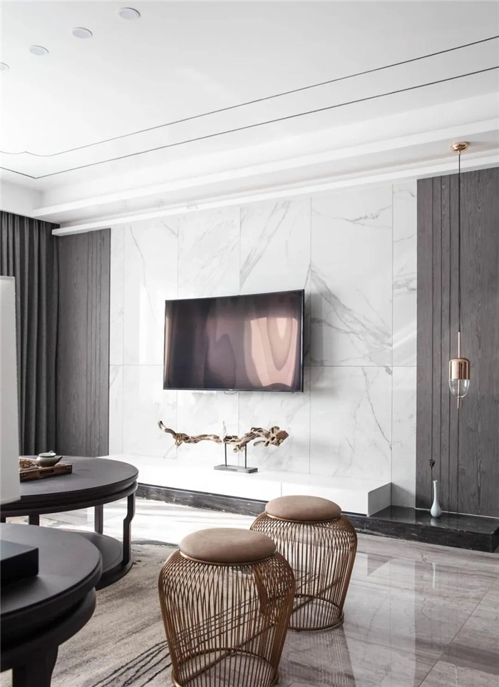 电视墙面没有多余的装饰,大理石的自然纹理流畅而富有艺术感,与两边的灰调木饰面进行材质上的碰撞,简约而富有质感