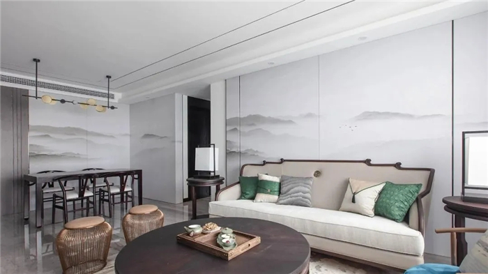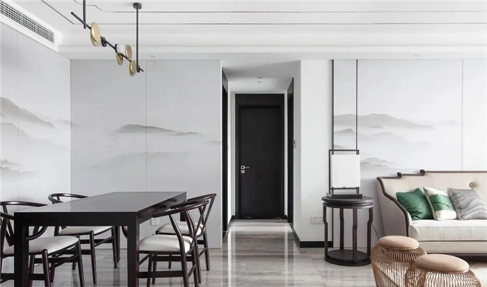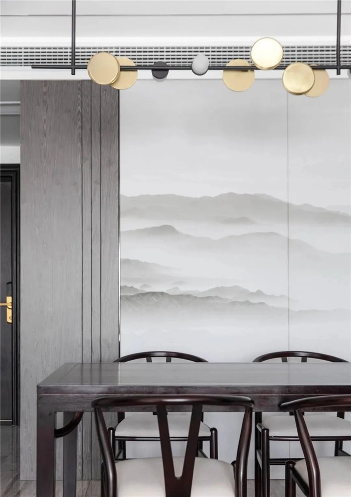 餐厅在低饱和度灰调的整体环境里,雅致的中国风墙绘由客厅自然延伸而来