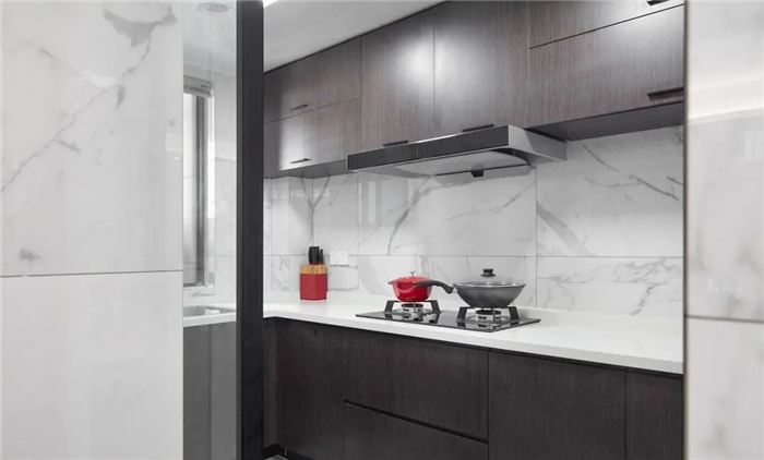 厨房延续公共空间的灰白主调,整体纯净明亮,石材自带的花纹,更添一份自然与别致