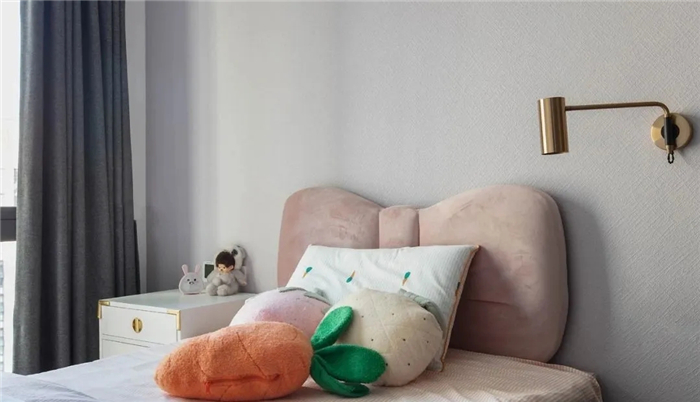 儿童房在安静内敛的灰调中融入温柔优雅的烟粉色,清新可爱的果蔬抱枕增添活力与幸福感