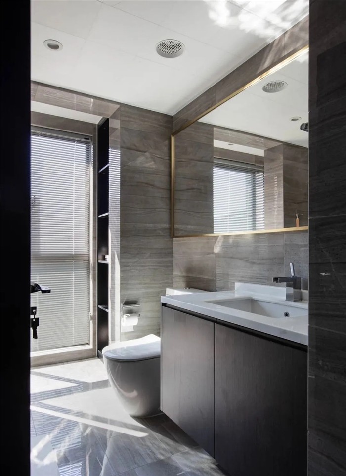 卫生间灰调瓷砖铺设墙地面缔造出完美的品质感,金色镜框勾勒出精致感,白色百叶帘随阳光形成的条纹光影滤出一份静谧时光