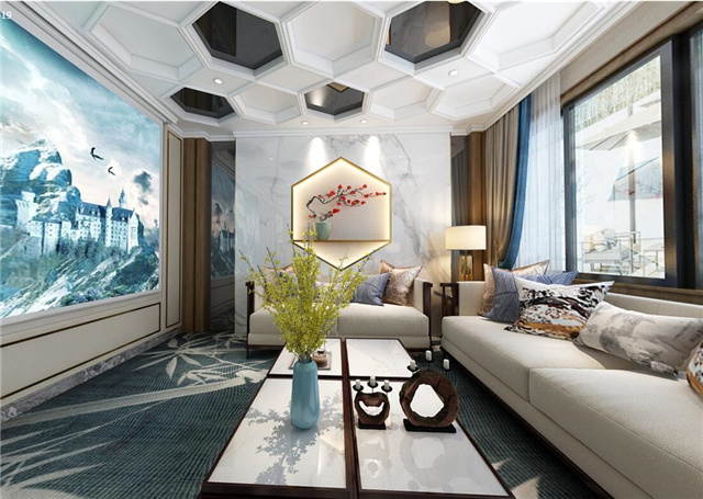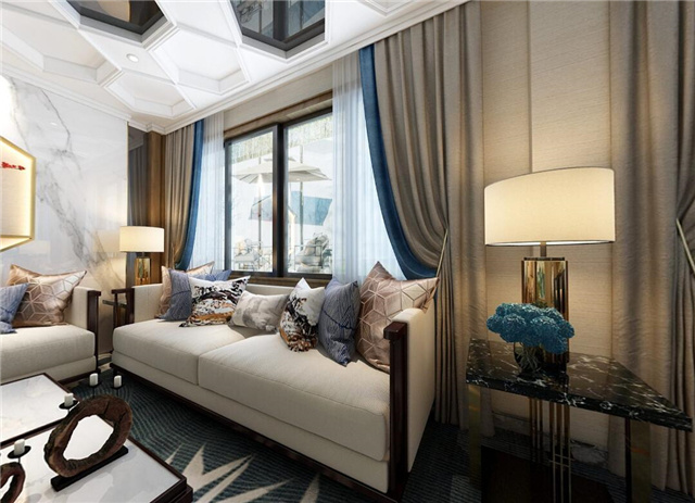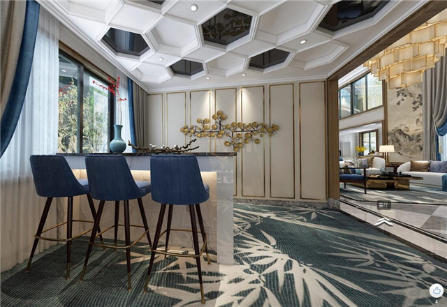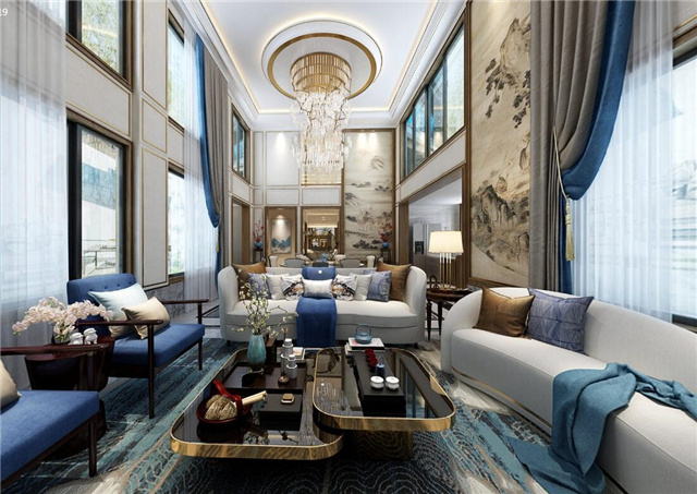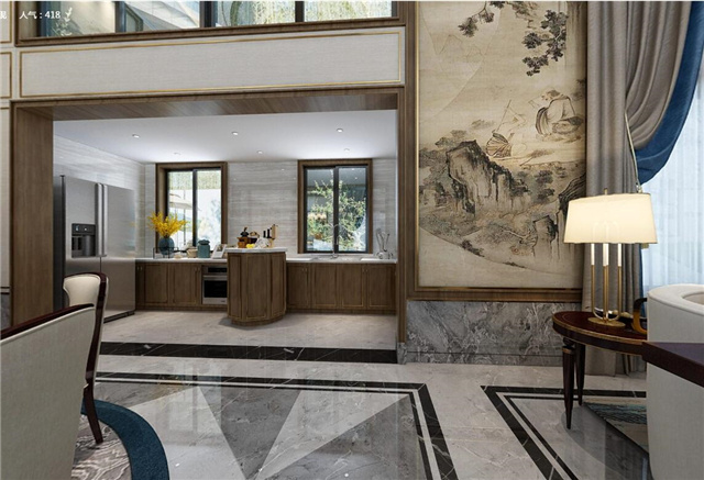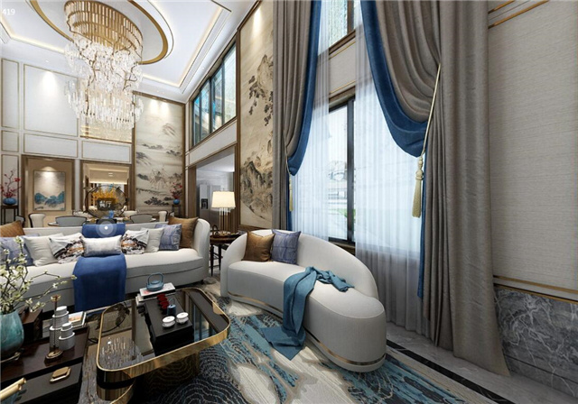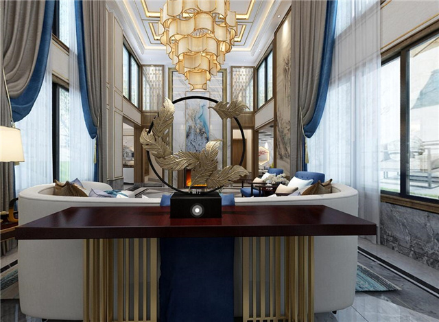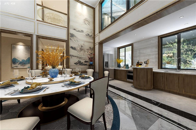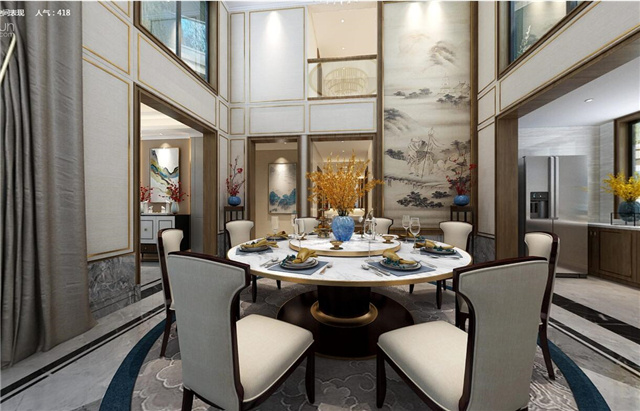 本案采用现代的设计语言来表达东方的意境。隐去传统中式繁复沉重的设计表现,用减法来表达东方元素。客厅与餐厅中空的空旷与豪气,即明确了空间界限,顶面的圆形与方形的吊顶相互结合、以表达天圆地方的中式意境。也体现东方意境疏浅高低的空间布局。
