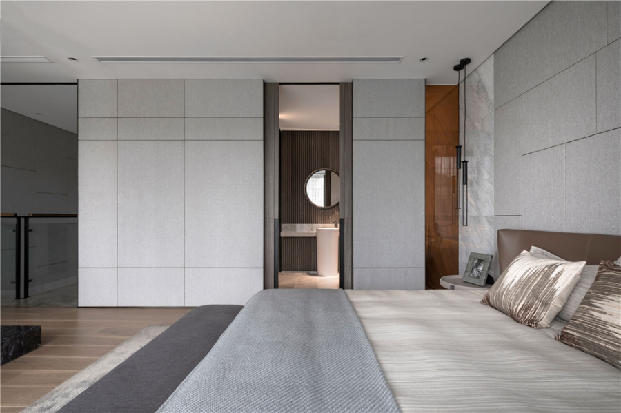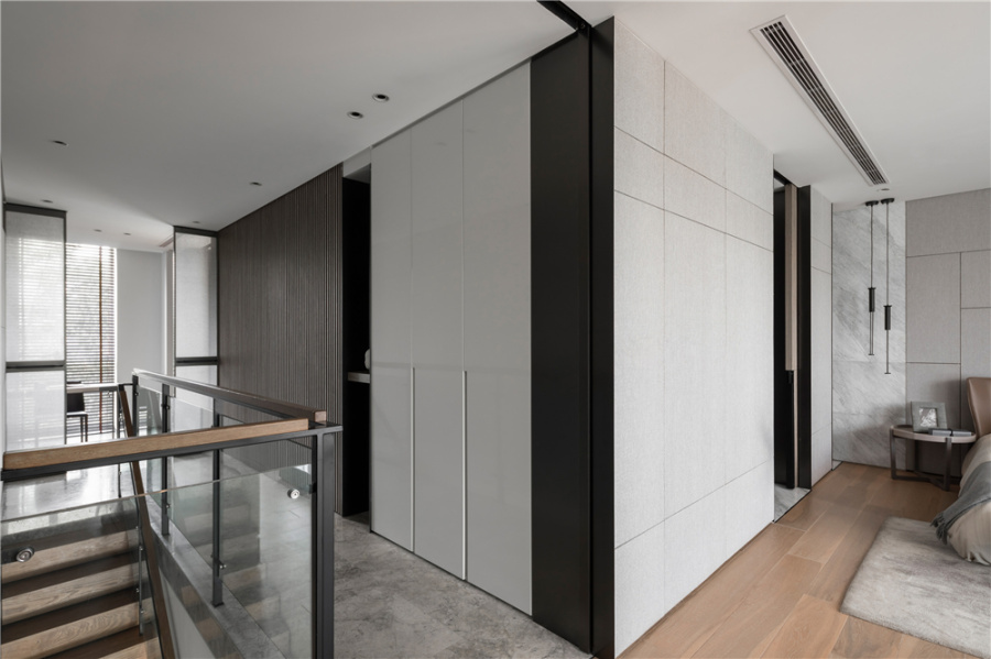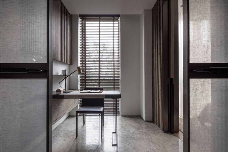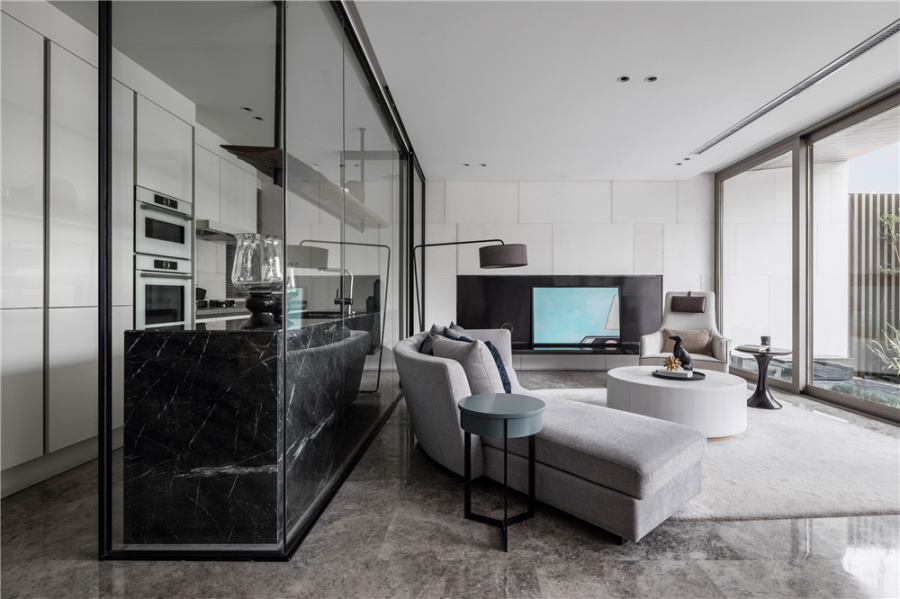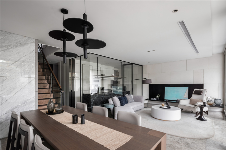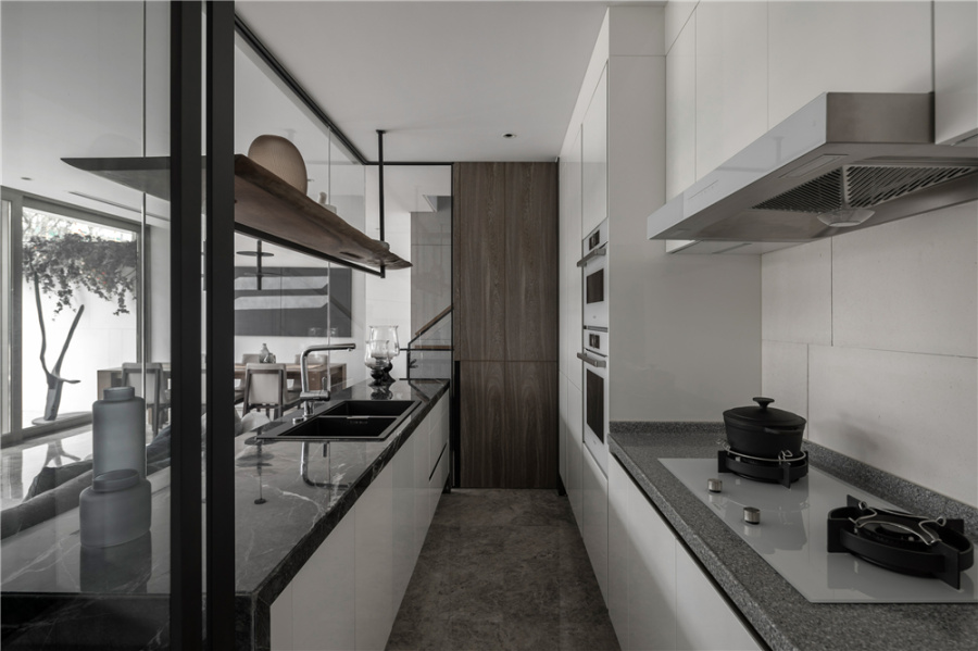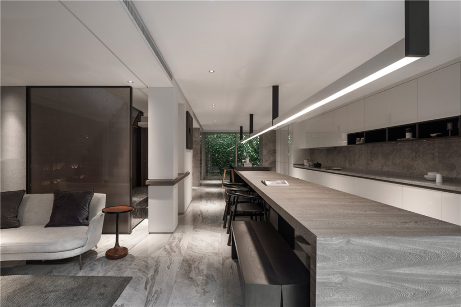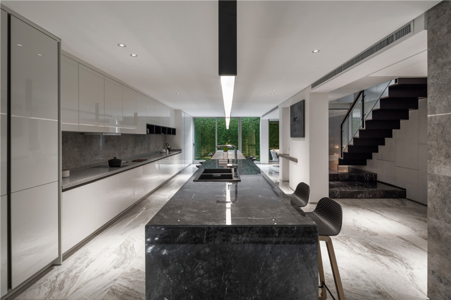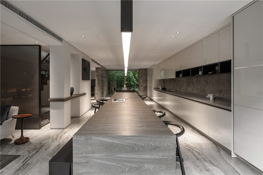 将画面转到义乌,在山明水秀、人文荟萃的义乌,希望将室内建筑形成一个轻盈的载体,去乘载居室中的人文气韵。我们屏去厚重的墙体、将厨房打造成景观厨房,使作菜时光入景怡情。地下层的宴客厅也和天井绿植墙产生亲密的关联,使绿的踪迹流淌在家的每一处角落、入画。