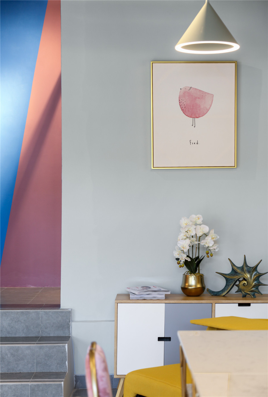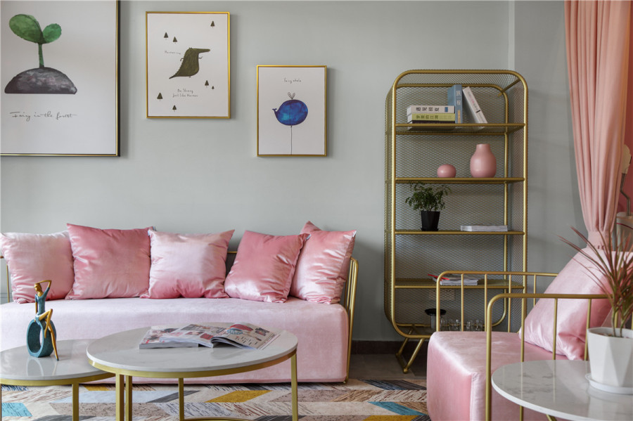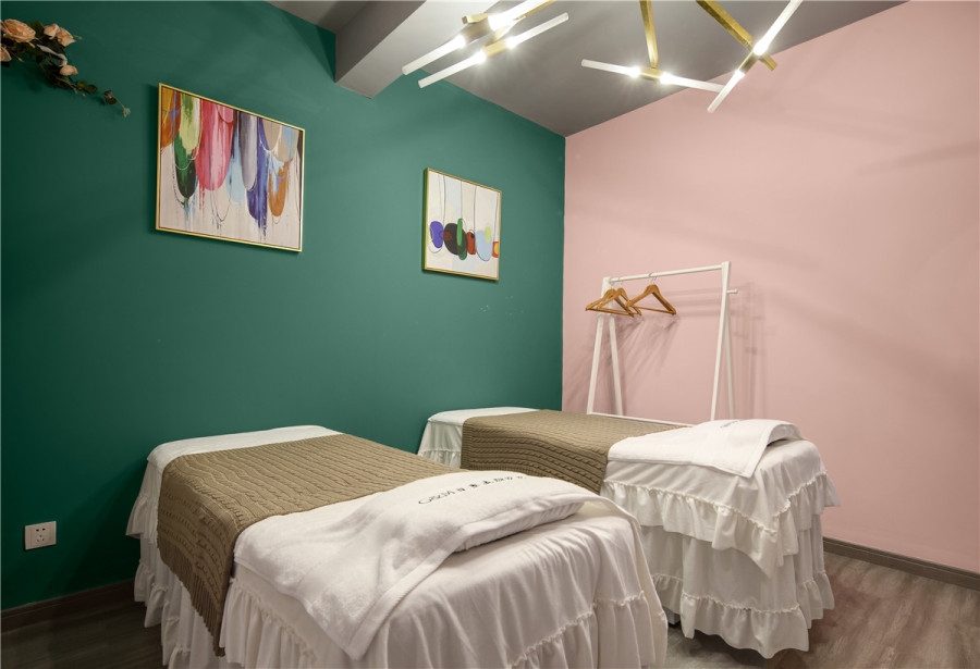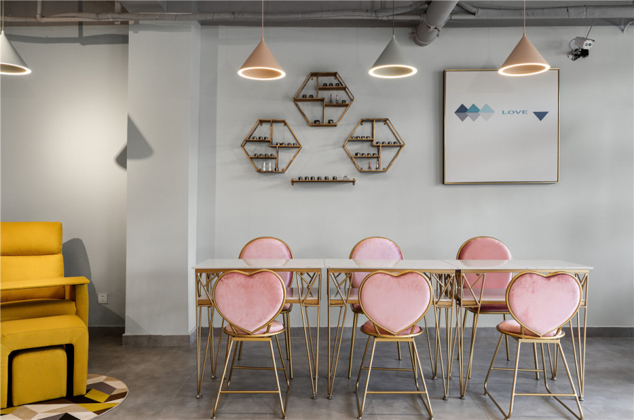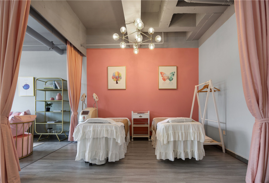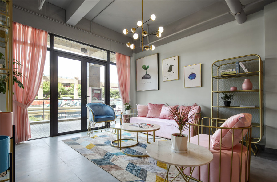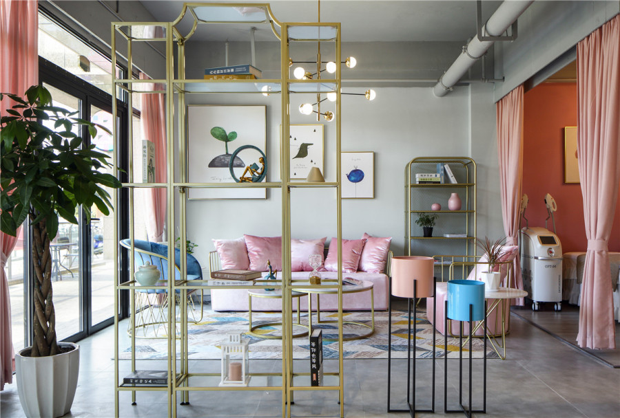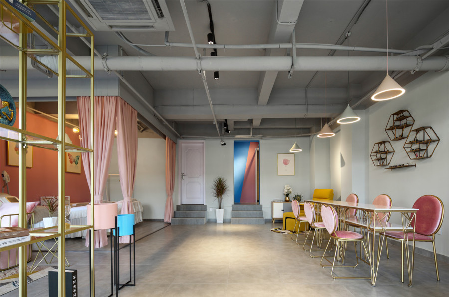 整体风格以工业轻奢风,色调以粉色、奶灰色为主,蓝色、绿色作为点缀也用在空间里,每个角度所呈现的感觉都是独特的,让顾客来店能享受不一样的体验感!所有的软装饰品全部由我们统一设计、搭配,包括家具、灯具、窗帘、壁画、地毯、饰品等,整体给人的感觉就是很温馨,很舒适!